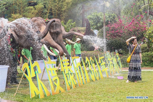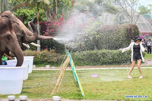 Elephants splash water at revellers on the water-sprinkling festival at the Wild Elephant Valley scenic spot in Dai Autonomous Prefecture of Xishuangbanna, southwest China's Yunnan Province, April 14, 2019. People sprinkle water to each other to pray for good fortune during the traditional water-sprinkling festival, which is also the New Year festival of the Dai ethnic group. (Photo:Xinhua)