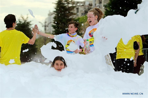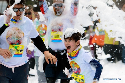 People participate in a color run event in Bucharest, Romania, on April 20, 2019. (Photo:Xinhua)