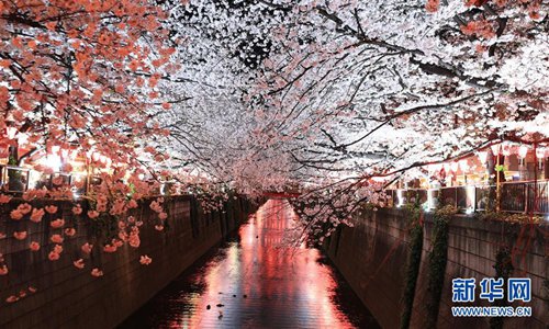 Photo taken on April 3, 2019 shows cherry blossoms along Meguro River in Tokyo, Japan.
