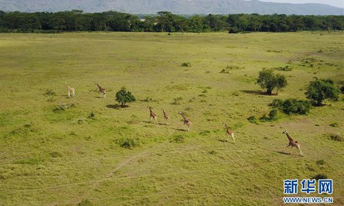 Photo taken on June 21, 2017 shows a group of giraffes running in Lake Nakuru National Park, Kenya.
