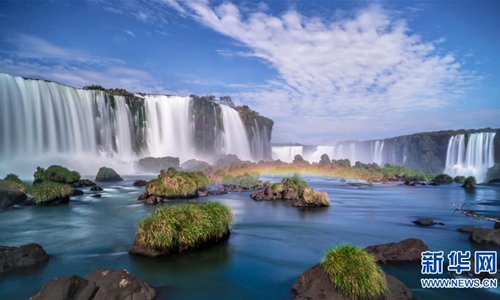 Photo taken on May 24, 2015 shows the rainbow over Iguazu Falls which is on the border between Argentina and Brazil.
