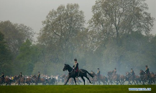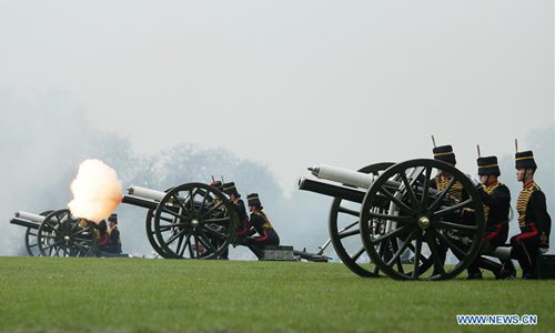 Members of the King's Troop Royal Horse Artillery take part in a gun salute to to mark Queen Elizabeth II's 93rd birthday in Hyde Park of London, Britain, April 22, 2019. (Photo: Xinhua)