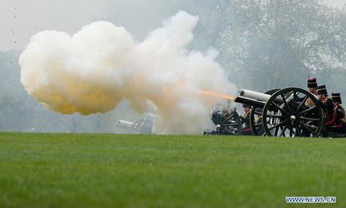 Members of the King's Troop Royal Horse Artillery fire a 41-round gun salute to mark Queen Elizabeth II's 93rd birthday in Hyde Park of London, Britain, April 22, 2019. (Photo: Xinhua)