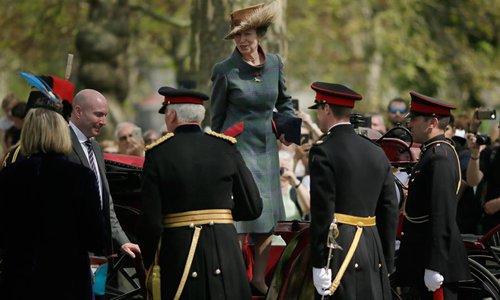 British Princess Anne leaves after the King's Troop Royal Horse Artillery fired a 41-round gun salute to mark Queen Elizabeth II's 93rd birthday in Hyde Park of London, Britain, April 22, 2019. (Photo: Xinhua)