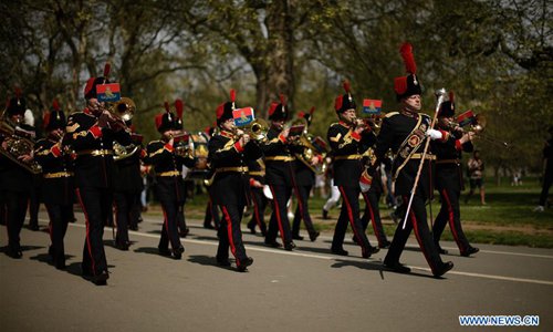 A military band marches after the King's Troop Royal Horse Artillery fired a 41-round gun salute to mark Queen Elizabeth II's 93rd birthday in Hyde Park of London, Britain, April 22, 2019. (Photo: Xinhua)