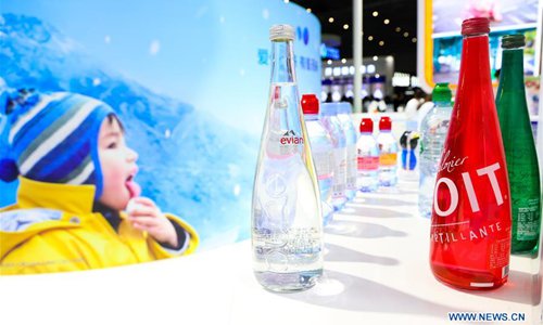Photo taken on Nov. 7, 2018 shows bottled water and Aquadrink of Danone displayed at the Food & Agricultural Products area of the first China International Import Expo (CIIE) in Shanghai, east China. Food of a particular place is an important symbol of local geographic and cultural characteristics. Food carries history and tradition, leads the tide of trade, strengthens diplomatic relations, disseminates and promotes culture. Food has been serving as connections between people around the world. In ancient times, food such as grapes, pomegranates, walnuts, coriander, cucumbers and sesame seeds were introduced to China along the Silk Road. Nowadays, thanks to the Belt and Road Initiative, red wine, coffee, dried fruits, meat, seafood, and dairy products from foreign countries enter the homes of ordinary people, turning daily meals into feasts with exotic cuisines. (Photo: Xinhua)