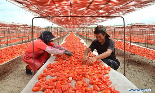 Farmers of Xinjiang Production and Construction Corps air tomatoes at the Yanqi Basin area, northwest China's Xinjiang Uygur Autonomous Region, Aug. 17, 2015.The air dried tomato produced in Xinjiang is popular among forign markets for its high quality. Food of a particular place is an important symbol of local geographic and cultural characteristics. Food carries history and tradition, leads the tide of trade, strengthens diplomatic relations, disseminates and promotes culture. Food has been serving as connections between people around the world. In ancient times, food such as grapes, pomegranates, walnuts, coriander, cucumbers and sesame seeds were introduced to China along the Silk Road. Nowadays, thanks to the Belt and Road Initiative, red wine, coffee, dried fruits, meat, seafood, and dairy products from foreign countries enter the homes of ordinary people, turning daily meals into feasts with exotic cuisines. (Photo: Xinhua)