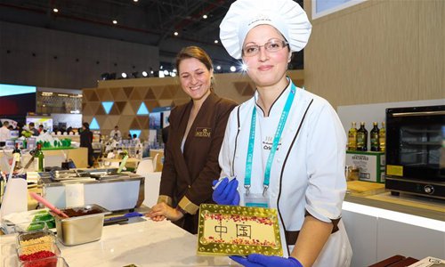 Exhibitors of Swiss chocolate maker Heidi shows a bar of chocolate with the pattern reading "China" on its surface at the Food & Agricultural Products area of the first China International Import Expo (CIIE) in Shanghai, east China, on Nov. 7, 2018. Food of a particular place is an important symbol of local geographic and cultural characteristics. Food carries history and tradition, leads the tide of trade, strengthens diplomatic relations, disseminates and promotes culture. Food has been serving as connections between people around the world. In ancient times, food such as grapes, pomegranates, walnuts, coriander, cucumbers and sesame seeds were introduced to China along the Silk Road. Nowadays, thanks to the Belt and Road Initiative, red wine, coffee, dried fruits, meat, seafood, and dairy products from foreign countries enter the homes of ordinary people, turning daily meals into feasts with exotic cuisines. (Photo: Xinhua)