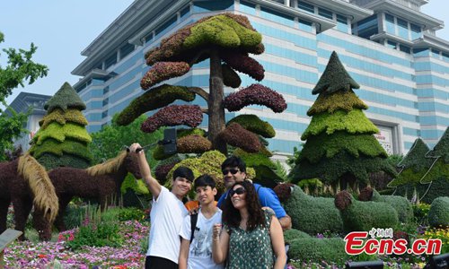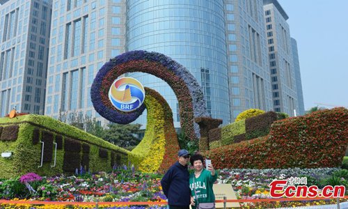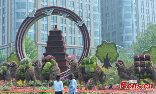 Decorative floral arrangements are installed all over Beijing to welcome the second Belt and Road Forum for International Cooperation (BRF), April 22, 2019. The theme of the second BRF, to be held from April 25 to 27, is, "Belt and Road Cooperation, Shaping a Brighter Shared Future." (Photo: China News Service)