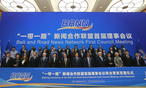 Representatives from council member media outlets of the Belt and Road News Network (BRNN) pose on Tuesday after signing a joint statement during their first council meeting in Beijing. Photo: Li Hao/GT