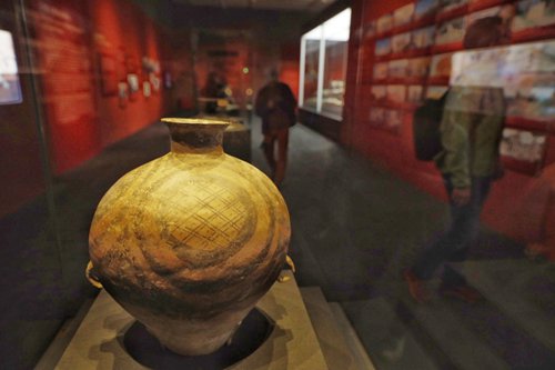 A piece of pottery painted with Majiayao culture ring patterns on display at the Exhibition of Chinese Artifacts Repatriated from Italy. Photo: Li Hao/GT
