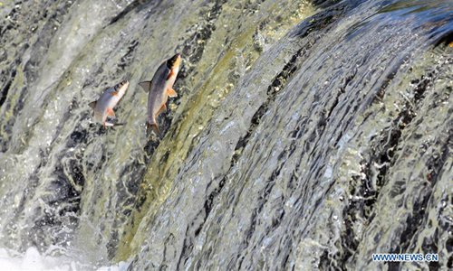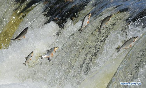 Fishes are seen jumping upstream at the Venta Rapid, a wide waterfall on the Venta River in Kuldiga, Latvia, April 26, 2019. Every spring an unusual scenery of flying fish is seen over the waterfall here on Venta River. Going up the stream for breeding, the fishes need to cross the over 240 meters wide rapid. To achieve this challenge they jump in the air over and over again until finally they can continue their way upstream.(Photo:Xinhua)