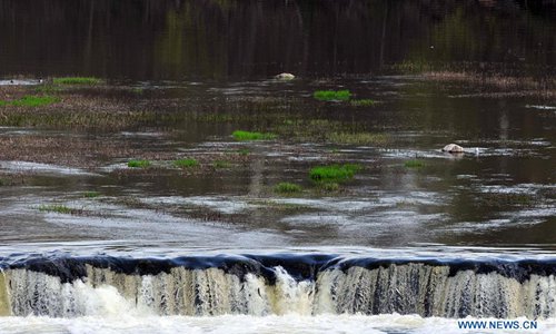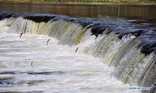 Photo taken on April 26, 2019 shows the Venta Rapid, a wide waterfall on the Venta River in Kuldiga, Latvia. Every spring an unusual scenery of flying fish is seen over the waterfall here on Venta River. Going up the stream for breeding, the fishes need to cross the over 240 meters wide rapid. To achieve this challenge they jump in the air over and over again until finally they can continue their way upstream. (Photo:Xinhua)