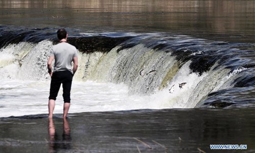 A man watches fishes jump upstream at the Venta Rapid, a wide waterfall on the Venta River in Kuldiga, Latvia, April 26, 2019. Every spring an unusual scenery of flying fish is seen over the waterfall here on Venta River. Going up the stream for breeding, the fishes need to cross the over 240 meters wide rapid. To achieve this challenge they jump in the air over and over again until finally they can continue their way upstream. (Photo:Xinhua)