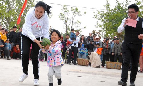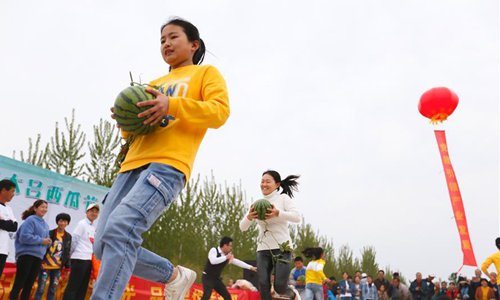 Competitors participate in a running competition with a watermelon during a watermelon festival in Duanbolan Town of Jimo District in Qingdao City, east China's Shandong Province, April 27, 2019. The 4th watermelon festival in Duanbolan Town opened on Saturday, and attracted lots of villagers and visitors. (Xinhua/Zhang Tao)