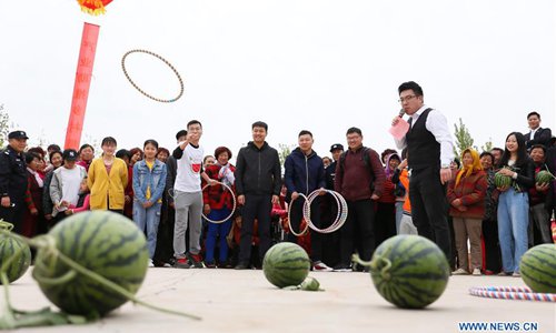 Competitors participate in a ringtoss competition during a watermelon festival in Duanbolan Town of Jimo District in Qingdao City, east China's Shandong Province, April 27, 2019. The 4th watermelon festival in Duanbolan Town opened on Saturday, and attracted lots of villagers and visitors. (Xinhua/Liang Xiaopeng)