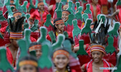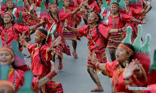 Dancers perform during the annual Aliwan Fiesta along the Roxas Boulevard in Manila, the Philippines, April 27, 2019. The Aliwan Fiesta is the annual summer dance festival competition in the Philippines, showcasing folk and ethnic performing art from around the country. (Photo: Xinhua)