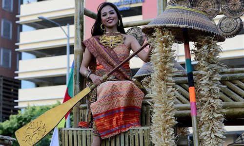 A woman waves during the annual Aliwan Fiesta along the Roxas Boulevard in Manila, the Philippines, April 27, 2019. The Aliwan Fiesta is the annual summer dance festival competition in the Philippines, showcasing folk and ethnic performing art from around the country. (Photo: Xinhua)