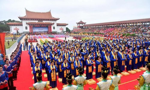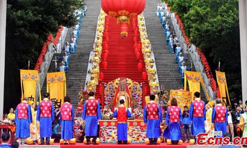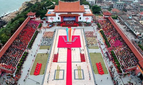 Thousands of people gather for a grand worship ceremony marking the 1,059th birthday of sea goddess Mazu on Meizhou Island in Putian City, East China's Fujian Province, April 27, 2019. Mazu is the deified form of Lin Mo, a shaman who lived in the 10th century on Meizhou Island. Revered after her death as a patron of seafarers, including fishermen and sailors, her worship spread throughout China's coastal regions and Chinese communities throughout Southeast Asia. (Photo: China News)