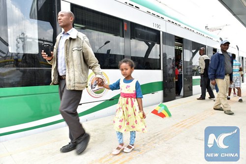 Local residents walk on the platform of a light rail station in Addis Ababa, Ethiopia, Sept. 20, 2015. (Photo: Xinhua)