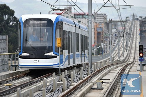 Photo taken on Sept. 20, 2015 shows a train operating on the light rail in Addis Ababa, Ethiopia.(Photo: Xinhua)