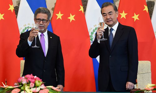 China's Foreign Minister Wang Yi (right) and El Salvador's Foreign Minister Carlos Castaneda lead a toast during a signing ceremony in Beijing in August 2018 establishing diplomatic relations between the two countries. Photo: AFP