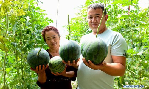 Two farmers show newly harvested greenhouse watermelons in Pizhan Township of Shanshan County, Turpan, northwest China's Xinjiang Uygur Autonomous Region, May 3, 2019. In Turpan, a major fruit production center, farmers have been busy harvesting greenhouse fruits such as nectarines, Hami melons and watermelons, which usually become ripe in late April and early May. (Photo: Xinhua)