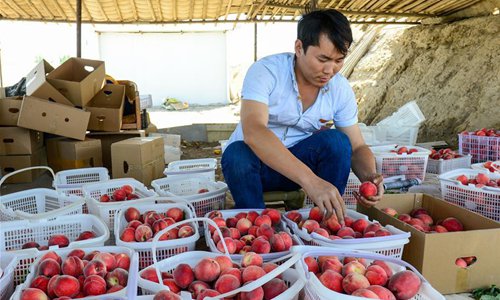 A farmer sorts and packs newly picked peaches in Pizhan Township of Shanshan County, Turpan, northwest China's Xinjiang Uygur Autonomous Region, May 3, 2019. In Turpan, a major fruit production center, farmers have been busy harvesting greenhouse fruits such as nectarines, Hami melons and watermelons, which usually become ripe in late April and early May. (Photo: Xinhua)