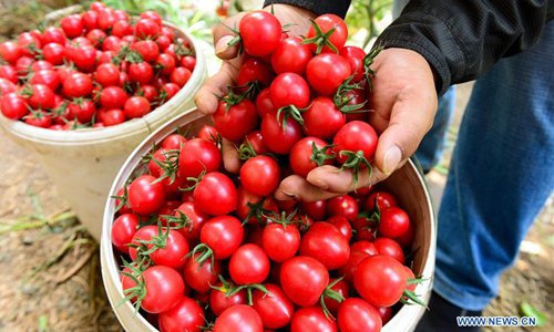 A farmer harvests cherry tomatoes at a greenhouse in Pizhan Township of Shanshan County, Turpan, northwest China's Xinjiang Uygur Autonomous Region, May 3, 2019. In Turpan, a major fruit production center, farmers have been busy harvesting greenhouse fruits such as nectarines, Hami melons and watermelons, which usually become ripe in late April and early May. (Photo: Xinhua)
