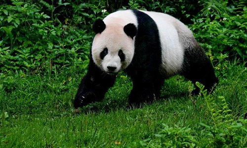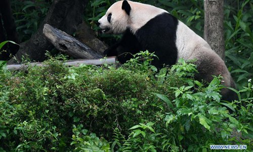 The giant panda Tuantuan plays at the Taipei Zoo in Taipei, southeast China's Taiwan, May 6, 2019. At the Taipei Zoo, the two giant pandas Tuantuan (male) and Yuanyuan (female) have drawn large crowds eager to catch a glimpse of the chubby bears through the past ten years. The two giant pandas were sent to Taiwan from the Chinese mainland in late 2008. In 2013, Tuantuan and Yuanyuan had a baby called Yuanzai. (Photo: Xinhua)
