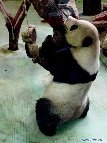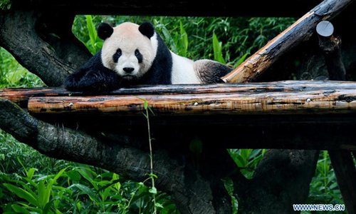 The giant panda Yuanyuan plays at the Taipei Zoo in Taipei, southeast China's Taiwan, April 28, 2019. At the Taipei Zoo, the two giant pandas Tuantuan (male) and Yuanyuan (female) have drawn large crowds eager to catch a glimpse of the chubby bears through the past ten years. The two giant pandas were sent to Taiwan from the Chinese mainland in late 2008. In 2013, Tuantuan and Yuanyuan had a baby called Yuanzai. (Photo: Xinhua)