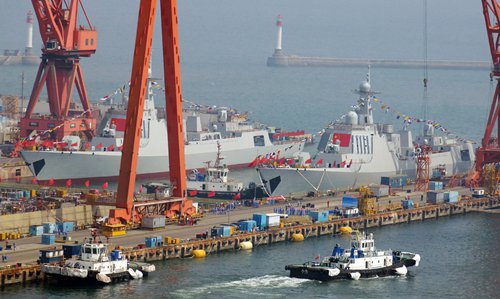 Decked with Chinese national flags, the two Type 052D destroyers were launched in the Dalian Shipyard on Friday with the assistance of tug boats, marking the 19th and 20th of launches of their kind, news website wenweipo.com reported on Friday.