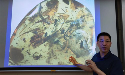 Wang Bo, a researcher with the Nanjing Institute of Geology and Palaeontology of the Chinese Academy of Sciences (NIGPAS), demonstrates a picture of the first known amber encasing an ancient sea animal called ammonite during a press conference in Nanjing, east China's Jiangsu Province, May 14, 2019. An international group led by Chinese scientists identified the first known amber encasing an ancient sea animal called ammonite about 100 million years ago. The study published on Monday in the Proceedings of the National Academy of Sciences described the 6.08 gram amber, which is 33 mm long, 9.5 mm wide and 29 mm high. The discovery provided a clue to ancient coastal forest ecology. (Photo: Xinhua)