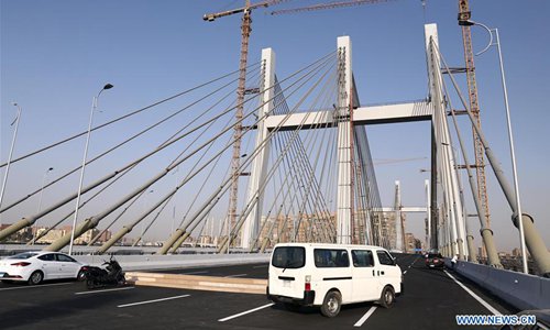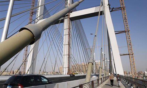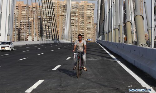 A man rides a bike on Rod al-Farag Axis Bridge in Cairo, Egypt, on May 15, 2019. Egyptian President Abdel Fattah al-Sisi attended on Wednesday the opening of Rod al-Farag Axis Bridge, the widest suspension bridge in the world, state-run Nile TV reported. (Photo: Xinhua)