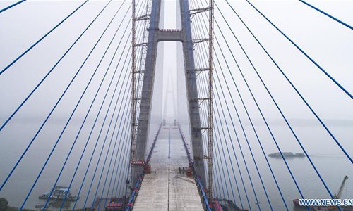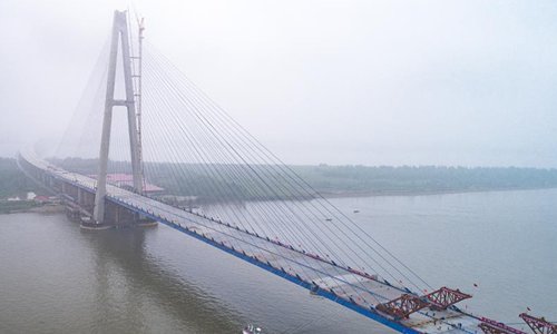 Aerial photo taken on May 16, 2019 shows the closure scene of Qingshan Yangtze River Bridge in Wuhan, central China's Hubei Province. The 7,548 meter-long Qingshan Yangtze River Bridge is now the widest bridge over Yangtze River. (Photo:Xinhua)