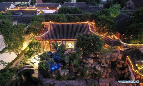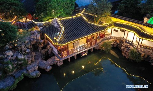 Aerial photo taken on May 22, 2019 shows the night view of the Master-of-Nets Garden, in Suzhou, east China's Jiangsu Province. In 1997, the classical gardens of Suzhou were put on the UNESCO's heritage list. In 2018, the total number of gardens included in the "Suzhou Garden List" reached 108, and Suzhou was officially transformed from "the City of Gardens" into "the City of 100 Gardens". (Photo: Xinhua)