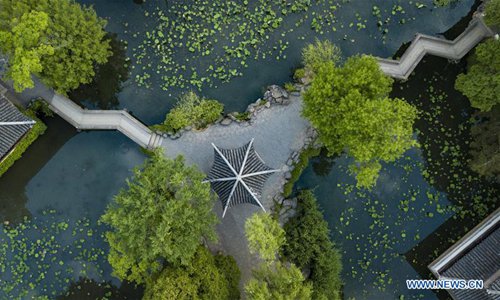 Aerial photo taken on May 21, 2019 shows the scenery of Humble Administrator's Garden in Suzhou, east China's Jiangsu Province. In 1997, the classical gardens of Suzhou were put on the UNESCO's heritage list. In 2018, the total number of gardens included in the "Suzhou Garden List" reached 108, and Suzhou was officially transformed from "the City of Gardens" into "the City of 100 Gardens". (Photo: Xinhua)