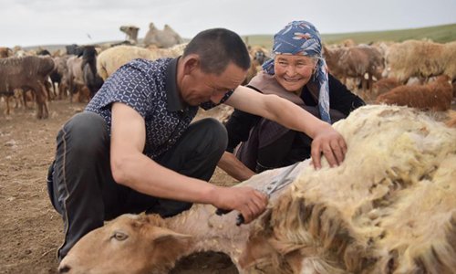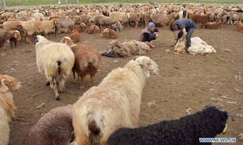 People shear a sheep in Fuhai County of Atlay, northwest China's Xinjiang Uygur Autonomous Region, on June 7, 2019. Photo: Xinhua