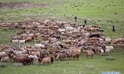 People drive sheep into a sheepfold for shearing in Fuhai County of Atlay, northwest China's Xinjiang Uygur Autonomous Region, on June 7, 2019. Photo: Xinhua