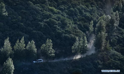 A car drives on the mountain road at Zoumatai Village of Wuqi County in Yan'an City, northwest China's Shaanxi Province, June 5, 2019. Wuqi County has carried out a development policy since 1998 that returned farmland to forest for ecological protection and sustainable development purposes. (Photo: Xinhua)