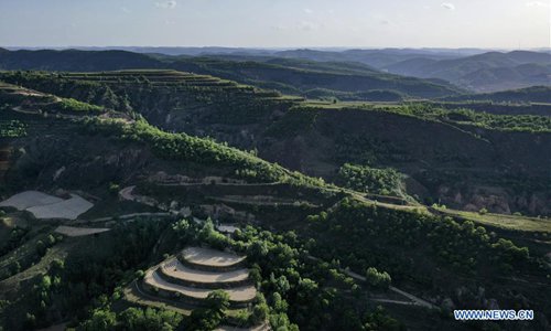 Aerial photo taken on June 8, 2019 shows the scenery of hills covered with green at Guopan Village of Wuqi County in Yan'an City, northwest China's Shaanxi Province. Wuqi County has carried out a development policy since 1998 that returned farmland to forest for ecological protection and sustainable development purposes. (Photo: Xinhua)
