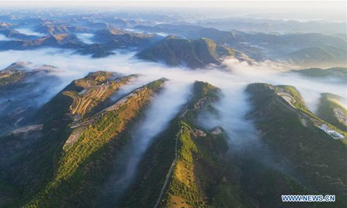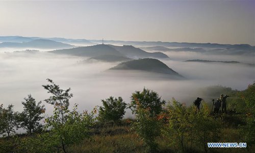 Photo taken on June 6, 2019 shows the flowing clouds over hills at Yangqing area of Wuqi County in Yan'an City, northwest China's Shaanxi Province. Wuqi County has carried out a development policy since 1998 that returned farmland to forest for ecological protection and sustainable development purposes. (Photo: Xinhua)
