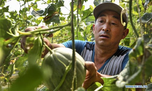 Ma Youen picks a melon at a greenhouse in Mawan Village of Wuqi County in Yan'an City, northwest China's Shaanxi Province, June 6, 2019. Wuqi County has carried out a development policy since 1998 that returned farmland to forest for ecological protection and sustainable development purposes. (Photo: Xinhua)