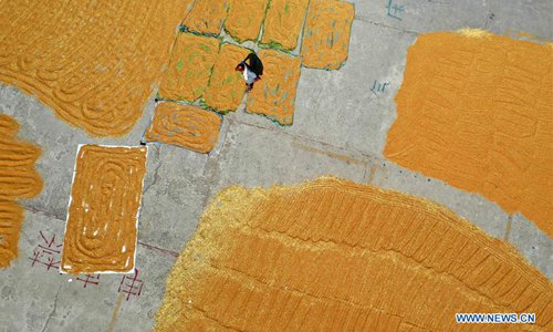 Aerial photo taken on June 13, 2019 shows a villager drying wheat at Guangcun Village of Zezhang Township in Yuncheng City, north China's Shanxi Province. (Xinhua/Gao Xinsheng)