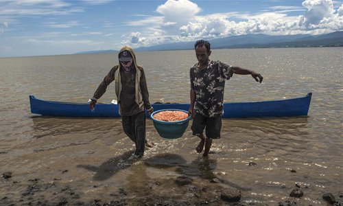 People carry a bucket of shrimp after harvesting in Palu, Indonesia, June 17, 2019. Shrimp will be processed at home factory in Palu and dried shrimp will be exported to some Asian countries. (Photo: Xinhua)