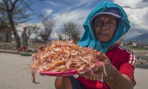 A man holds shrimp in Palu, Indonesia, June 17, 2019. Shrimp will be processed at home factory in Palu and dried shrimp will be exported to some Asian countries. (Photo: Xinhua)