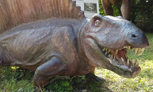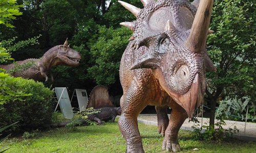 A dinosaur sculpture is seen on display at the garden of Natural History Museum in Budapest, Hungary, June 18, 2019. (Xinhua/Attila Volgyi)