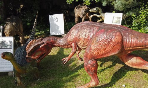 Dinosaur sculptures are seen on display at the garden of Natural History Museum in Budapest, Hungary, June 18, 2019. (Xinhua/Attila Volgyi)