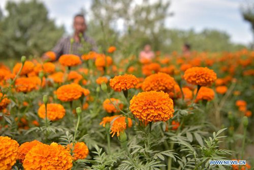 Full-bloom marigold flowers are seen on a farm in Shache County, northwest China's Xinjiang Uygur Autonomous Region, June 21, 2019. Farmers are busy with harvest work of about 130,000 mu (8,666.7 hectares) of full-bloom marigold flowers recently. (Photo: Xinhua)