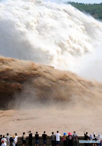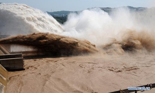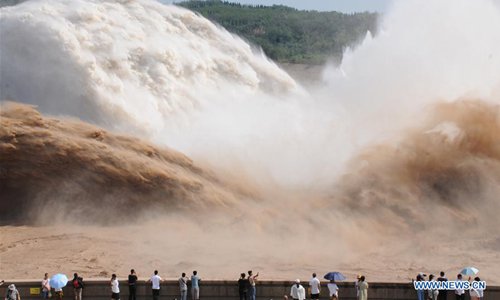 Tourists watch water gushing out from the Xiaolangdi Reservoir on the Yellow River in central China's Henan Province, July 2, 2019. (Photo: Xinhua)